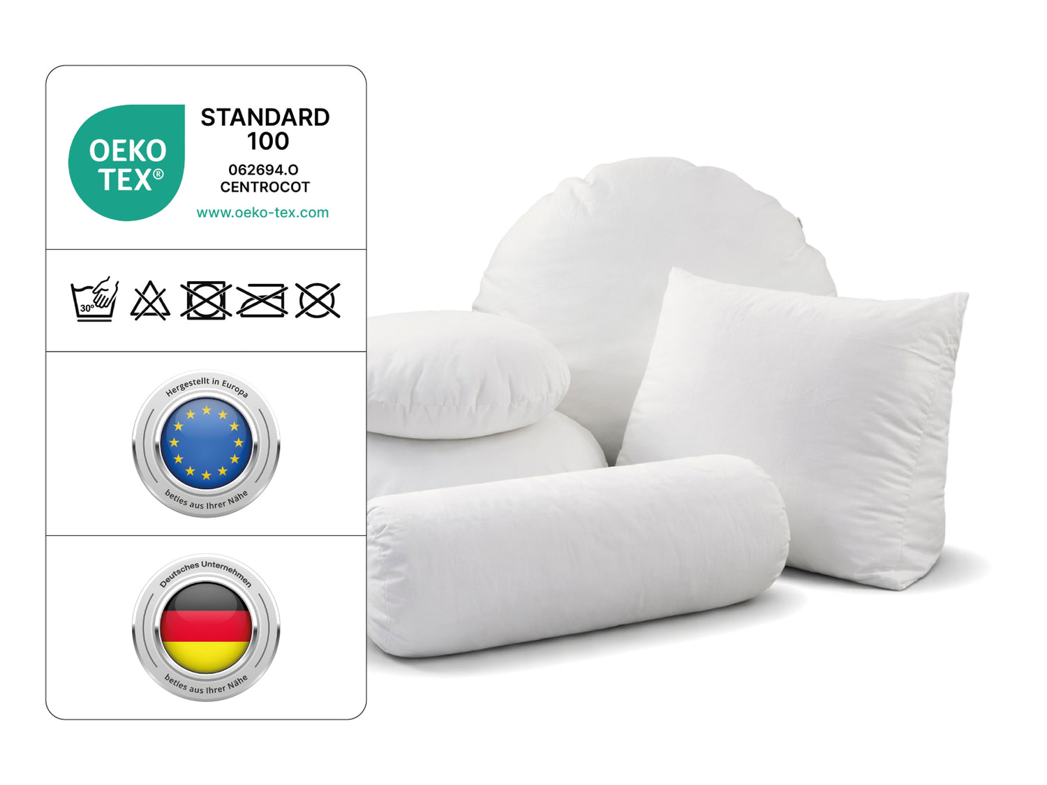 - Kissenhülle hygienisch waschbar (ohne Schaumstoffflocken), zertifiziert nach Öko-Tex Standard 100