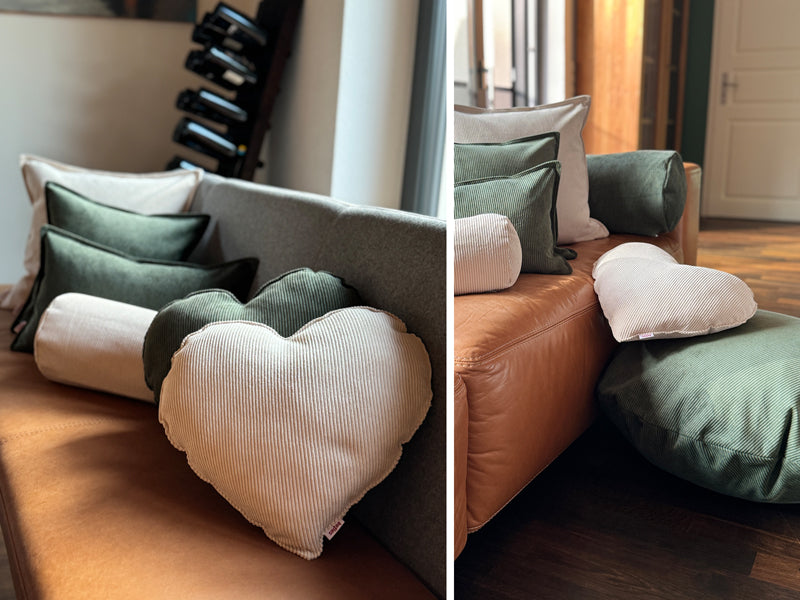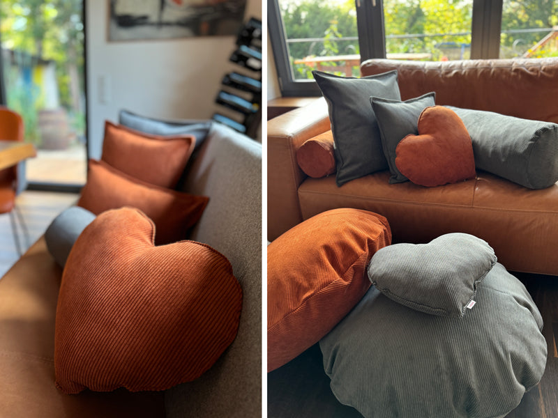 Unsere Cozy Cord weichen Bezüge, gefüllte Herzkissen und DIY-Zuschnitte sind die perfekte Ergänzung für Dein Sofa, Deinen Sessel, im Bett oder zum Verschenken. Hergestellt aus hochwertigem Cordsamt, gefüllt mit kuschelig weichen Polyesterflocken, fühlt sich das Kissen besonders weich und angenehm an.