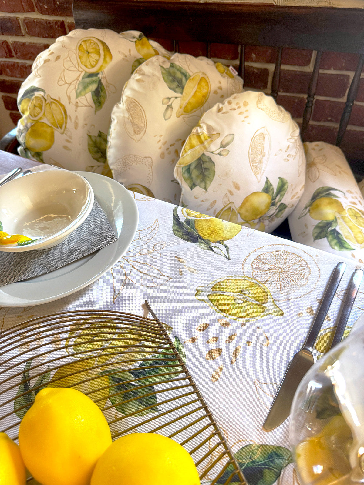 - DESIGN: Lebensechte Zitronen in Originalgröße mit zarten goldenen Akzenten – mediterranes Dekor, sommerliche Kissenbezüge, frische Wohnideen, stilvolle Tisch- und Raumdekoration, mediterranes Wohnaccessoire.