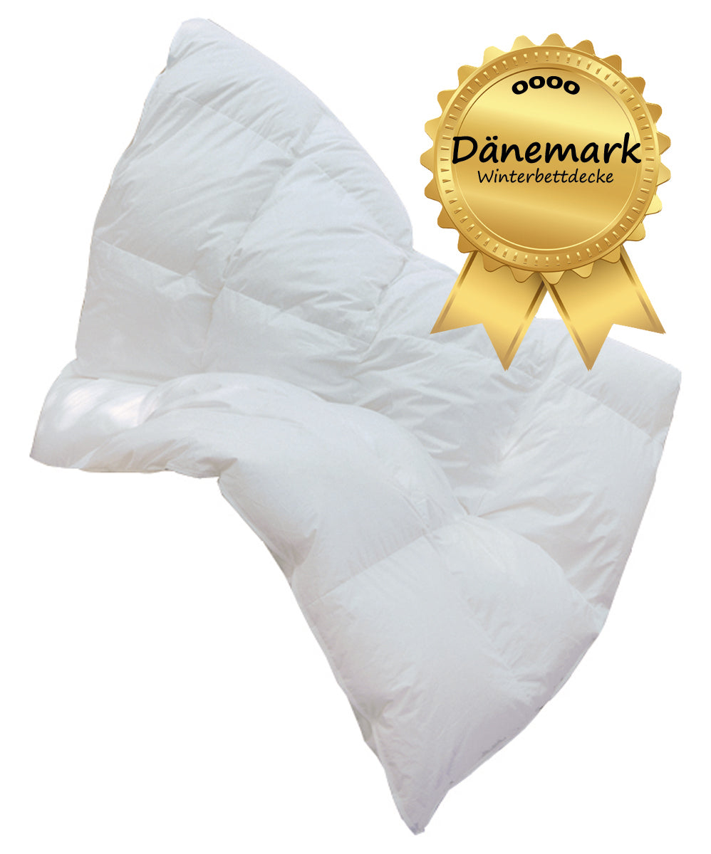 Dänemark Winterbettdecke 155x200 cm mit 1320g weißen, grönländischen, neuen Daunen und Federn Klasse 1. Sie ist Hausstauballergiker geeignet und ist insbesondere für Menschen geeignet, die gerne in einem herrlich warmen Bett oder in einem nicht geheizten Schlafzimmer schlafen. Die Füllung besteht aus 90% neuen Daunen und 10% neuen Federn. Es wurden nur beste, großflockige weiße grönländische Daunen und Federn der Klasse 1 verwendet.